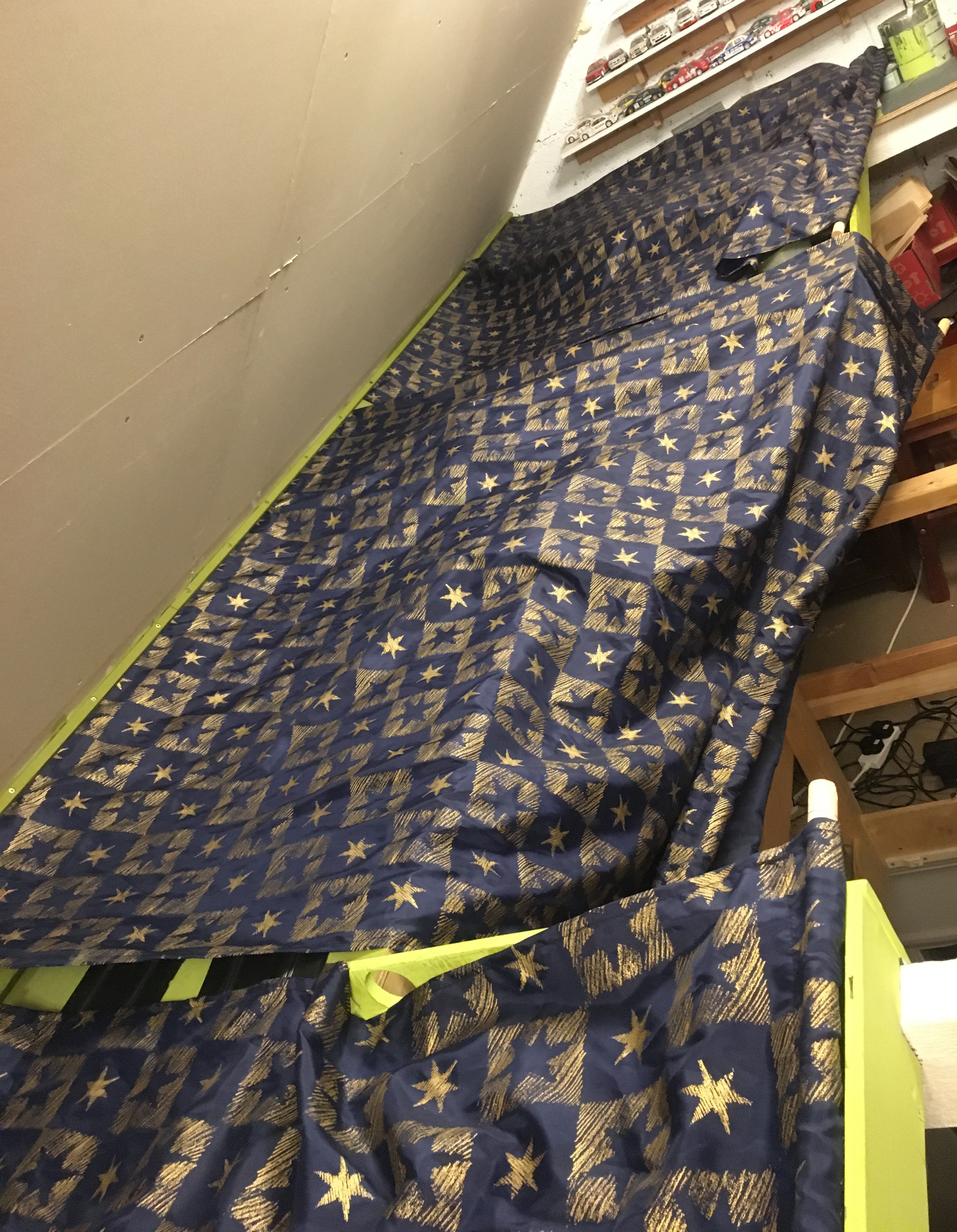 It's taken a couple of years to sort out my plan to make covers for the slot car table, but they're finally made and installed. My wife sewed a seam all the way around each of them and a loop along one end for the wood to fit into.