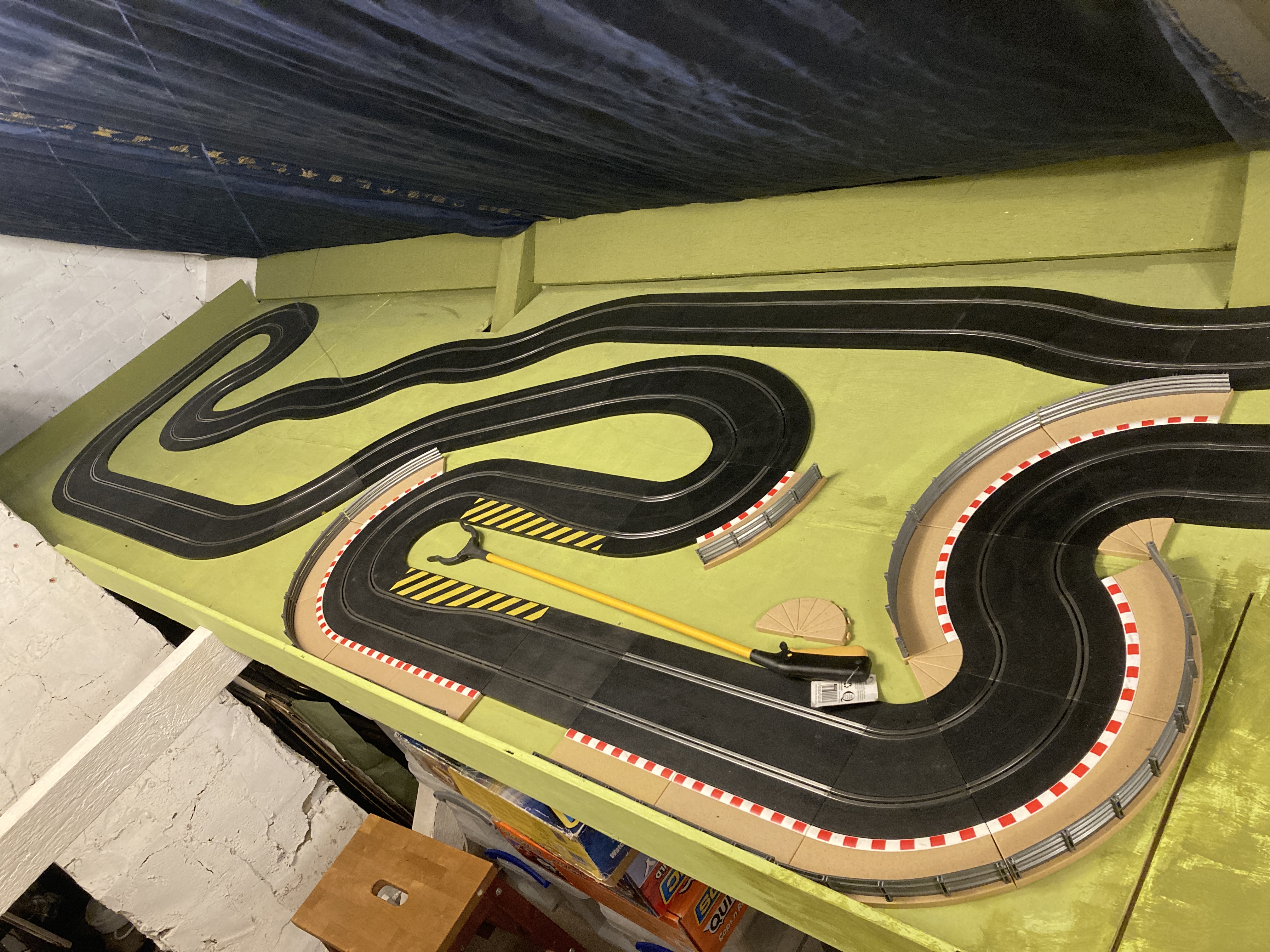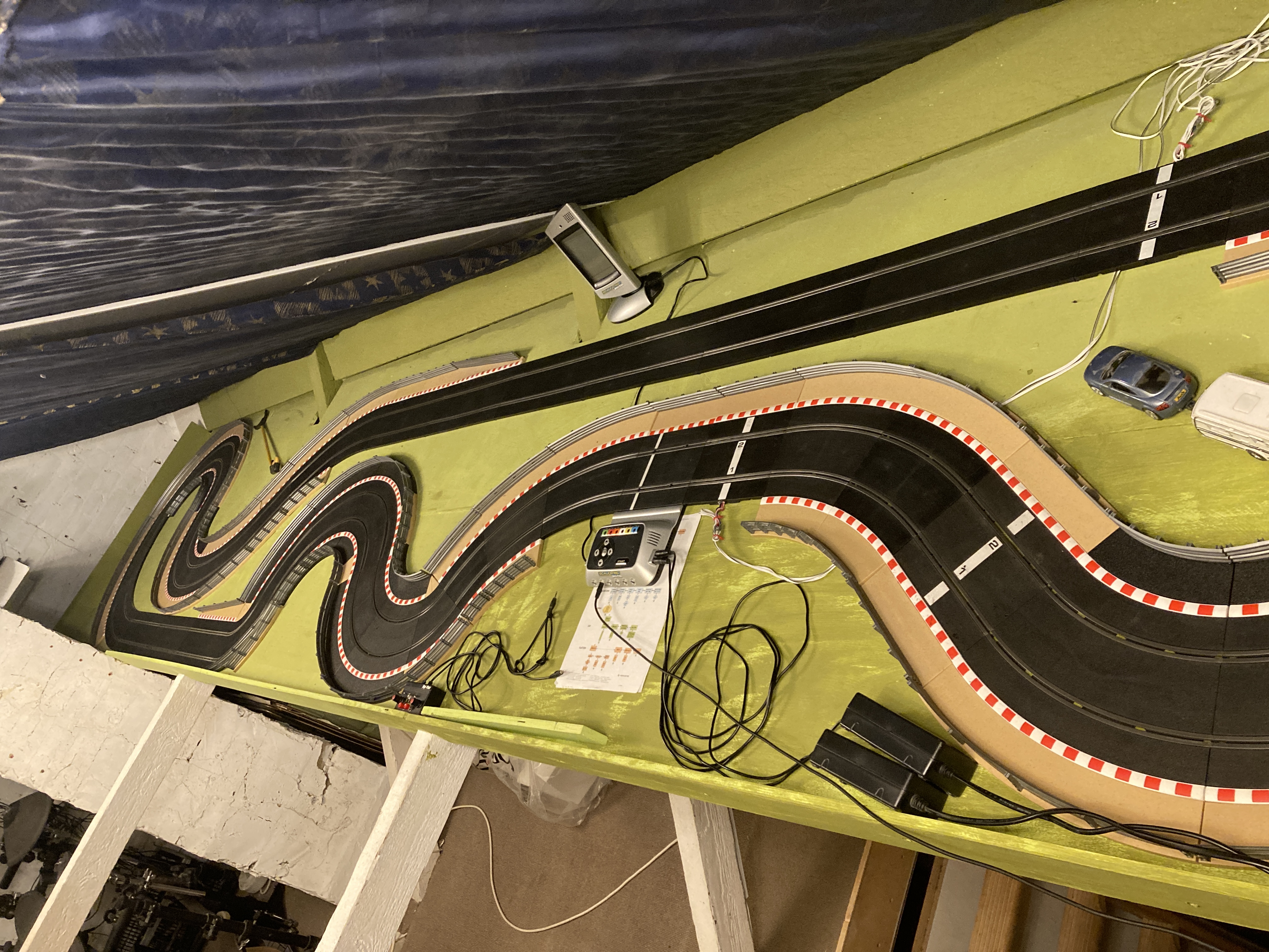 A couple of weeks ago a chum came round for an evening of racing and general slot car fun. He’s into cars and has recently set up a model railway in his loft and is really enjoying that, so I thought I’d introduce him to another potential use for his loft space! I thought a more challenging track was in order, something a bit slower and more involved. I particularly enjoy complex corners with a variety of radii so I tried to add a few of those. I took the time to turn every bit of track over and give the connection tabs a tweak before laying the track and it seems to have made quite a difference to how good the connectivity is. Definitely well worth doing, just a massive chore if you're laying a big track. I popped a power tap along the back straight too just in case.
