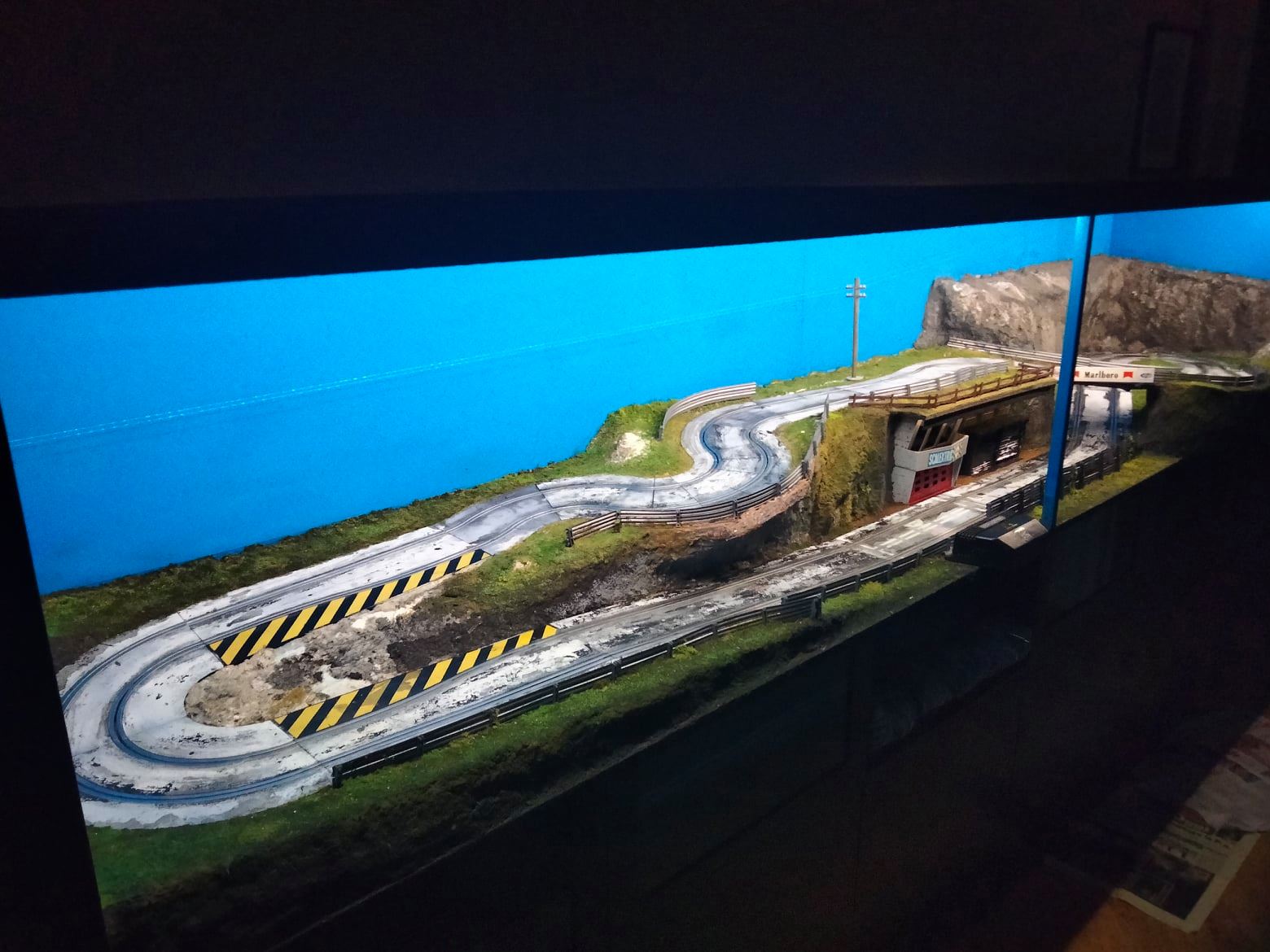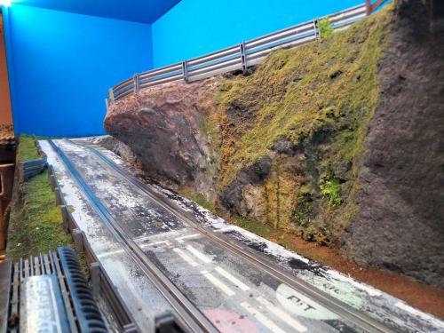 hello everyone, my name is Paolo, I live in Genoa (Italy). I am an old lover of electric trains (indoor G scale) and a few months ago I started the construction of a very small scalextric track in 1.32 scale (3 meters by 65cm). the photo of the hairpin bend (with support poles) is from yesterday, the others from a week ago. I think I'm at a good point, I'm finishing a bit of everything, I still lack some road signs, I'm waiting for 5 trees, then I'll put bushes, some figures (tourists / photographers), and various dust on the track. I wanted to take a disused road, almost abandoned, built on a track that was previously used as a race track, even in formula 1. My source of inspiration is the old track of Charade, in my opinion the most beautiful ever. a warm greeting to all, Paolo