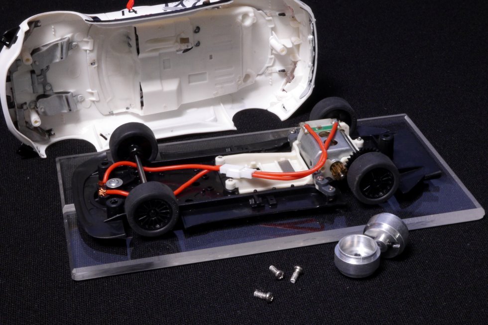 I plan to race the car, so plastic wheels needed replacing. They pulled off easily and the inserts were removed by poking a cocktail stick through the axle hole - an easy job. The C1 compound tyres and inserts were swapped to the aluminium hubs. Four plastic axle spacers are fitted, the two on the spur gear side are useful to space the wheels out to the 64mm the wheel arches allow, whilst keeping a good gear mesh. The rear wheels now have an attractive silver ring between tyre and inserts.