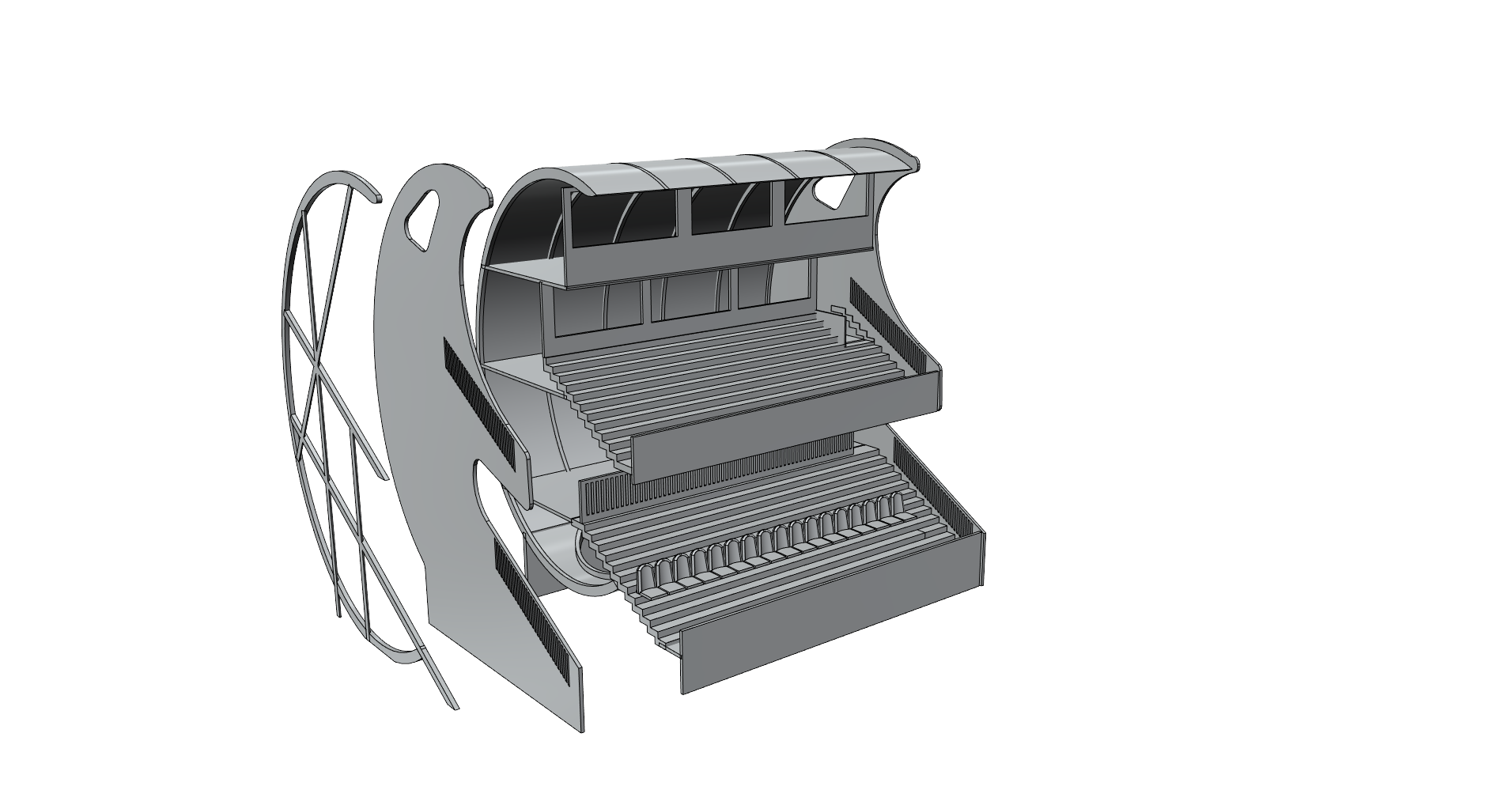 The design needs more work, I.e. a series of pegs and undercuts to support floors and frames but the major work is done. Included in the files is a seat run which will need to be edited to suit the figures used.