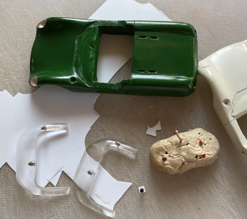 One of them has to be green! Some detailing work, clear plastic sprue and piano wire for mirrors, and brass nails for taillights.