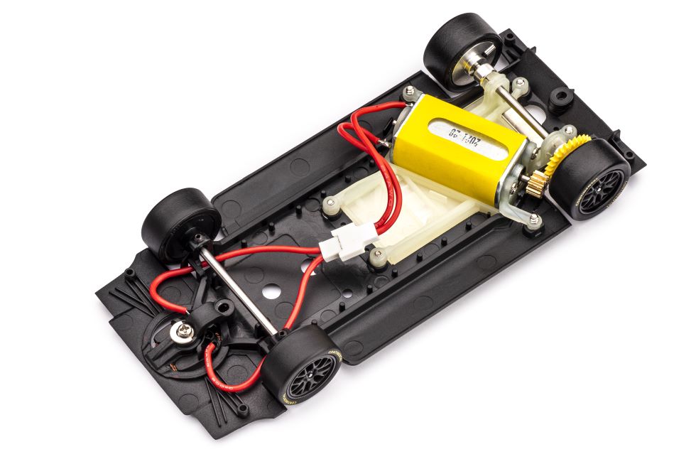 Underneath the sensational body shell, the layout is the standard Slot.it Lola LMP with a 20.5k Flat 6 motor in a 1mm offset anglewinder pod, 11:32 gearing, 17.3mm rims (aluminium at the rear), plus a screw-in LMP-style guide. There's also the new SP45 connector so the car can be converted to digital without soldering, using the appropriate Slot.it digital chip...