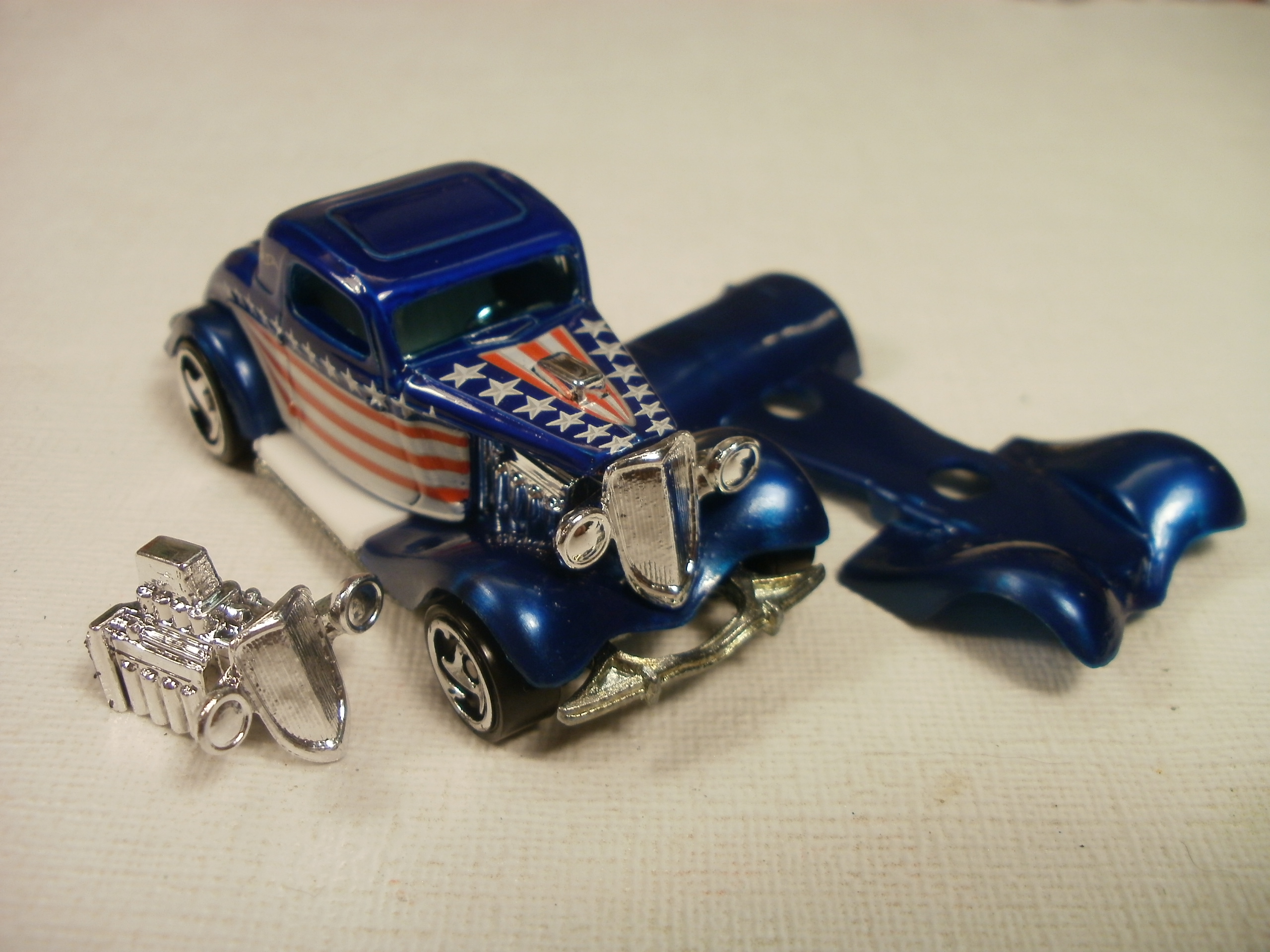 The 33-Ford has no exhaust, or engine scoop. But it comes with plastic fenders, grill, and headlights.