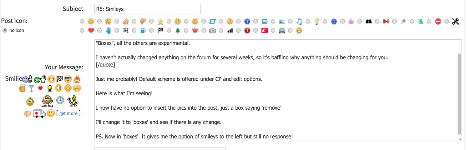 PS. Now in 'boxes'. It gives me the option of smileys to the left but still no response!