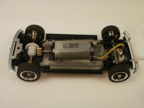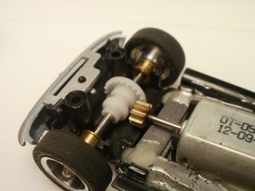 The rear axle was replaced with a Professor Motor upgrade, but we still retained the stock crown gear. The plastic 9T pinion was replaced with a 10T brass. The 18k motor was replaced with a 14k BWA slim-line. Low-friction brass replaced the stock plastic bushings. The motor shaft does not touch the crown gear. Instead, the crown is being centered by the wheels via 2-thrust washers on each side. Lead weight was added all over the chassis to meet the 70-gram minimum.