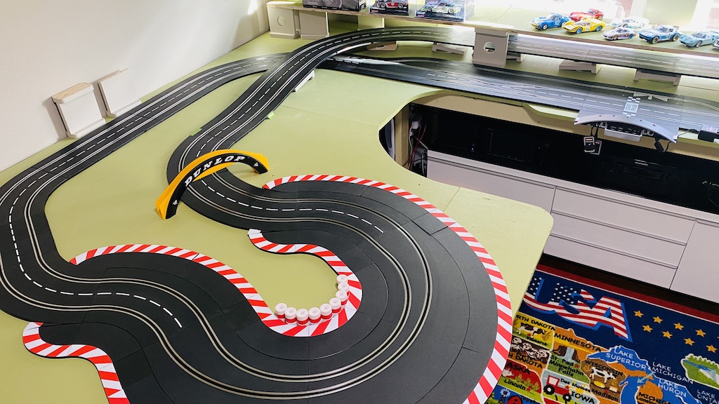 Slower section on left and high speed banked turn on right - run solo against ghost cars. Main interests going forward scratch building cars and scenery.