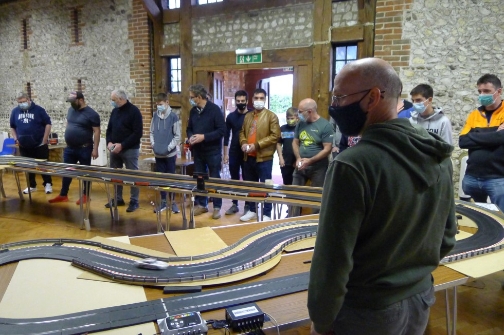 The Nascar race is split into three 20-minute stages, with each team running three of the six matching Scalextric Ford Taurus club cars. From the start, three teams showed plenty of excellent form – those were the quartets led by Ryan, Oliver and Isaac. Getting back into the swing of pit stops was a struggle for everyone – but some more than others. For this stage, only the fuel simulation was used, making things a little easier. At the end of 20 minutes, Ryan’s team were ahead on 85 laps, followed by Oliver, Jean, Duncan and Kevin on 83 and Isaac, Alex, Peter and Terry on 80. Jerome and Daniel’s teams were level on 76 – and Harry’s team of Mike D, Simon and Matthew were back on 65 laps after a tricky return to the Barn.