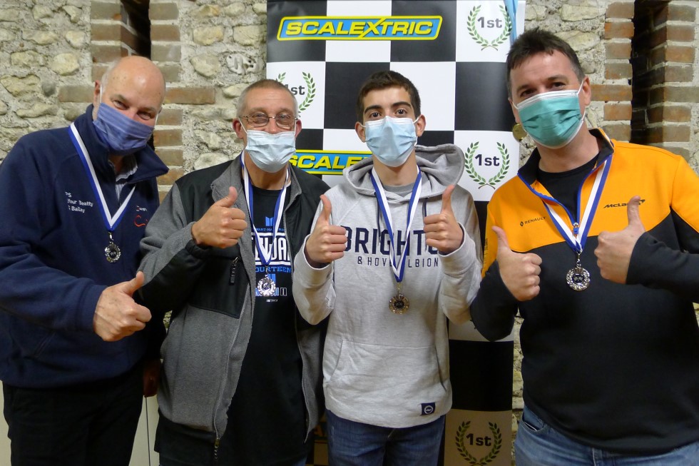 Mike has been busy over the past couple of years preparing three sets of matched club cars – and that’s partly for this eventuality. When the UPS car required more than routine repair, the marshals called for the substitute white Taurus. It probably went a bit quicker than the original too – and not only did they defend the 3-lap cushion, Ryan & Co managed to pull level on laps and finish just ahead of Oliver’s blue car by the end of the race. That was a nervous end to a great race for Ryan, Dean, Keith and Jeremy – and there were big smiles behind those masks on the podium. Oliver’s team were second, mulling over what could have been… Jerome, Andy, Ash and Alan had leapfrogged up to third with that big final stage win.