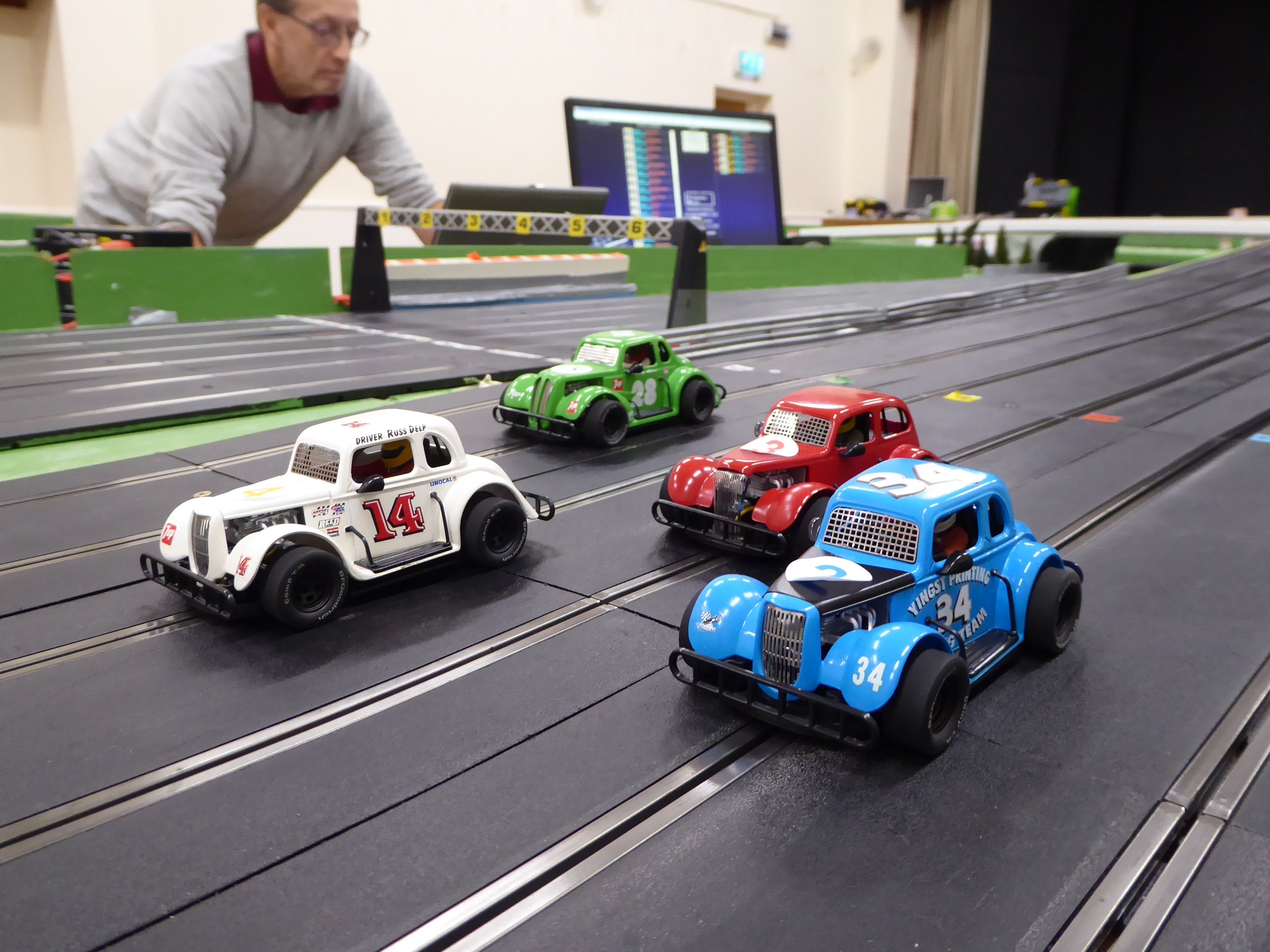 The squirrely blue car from the last meeting, https://slotracer.online/community/showt...50&page=12 ) fitted with the correct trued and 'diameter matched' tyres, behaved itself impecabbly to produce some great and very close racing. These run as sold, other than supergluing the wheels to the axles then truing up the wheels and sanding the tyres. Stock guides are retained with a nut and washer.