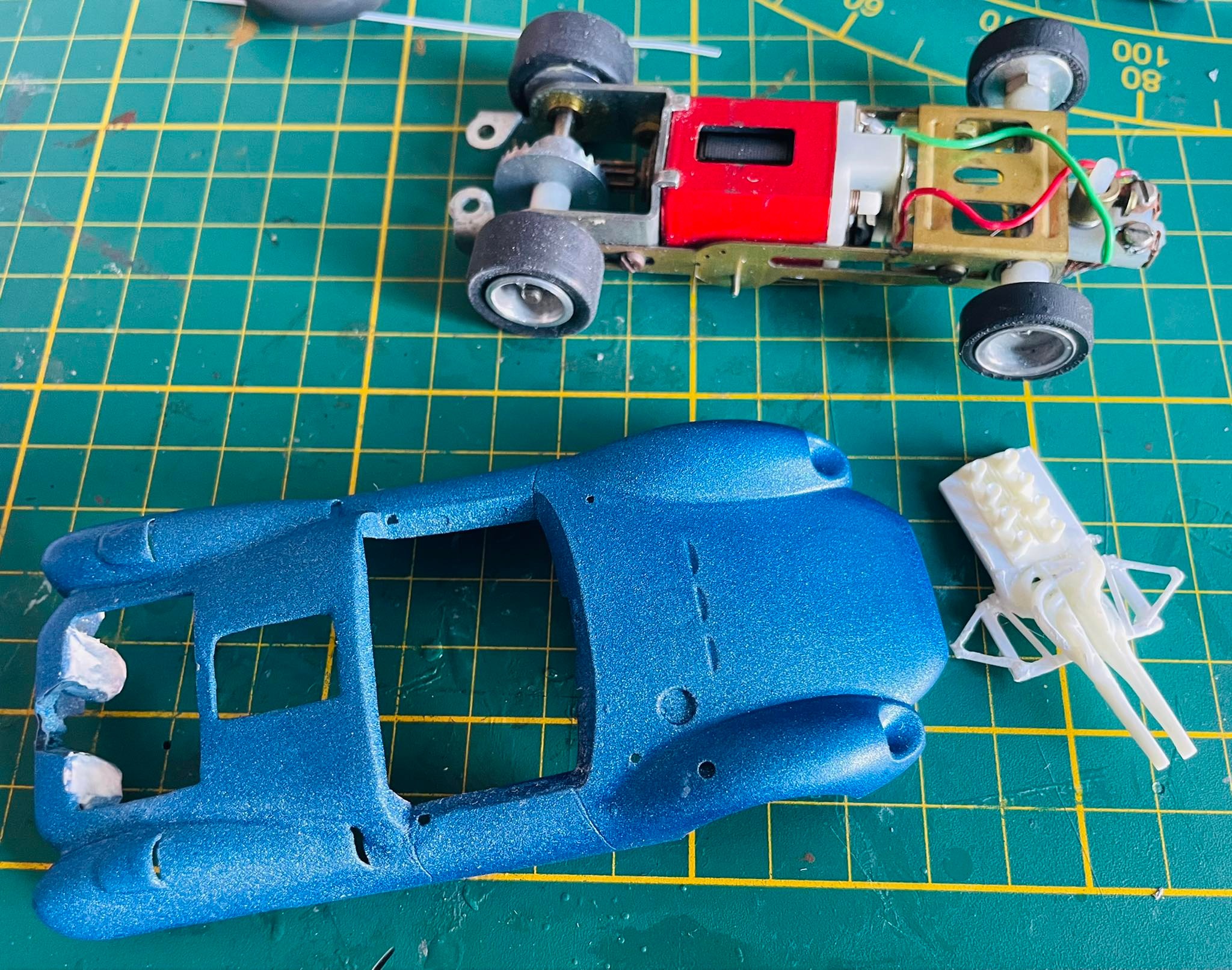 Added decals - and added driver deck. This is attached to the mabuchi and not the body. This is the current position of the car. STill quite a way to go to finish and tidy up.