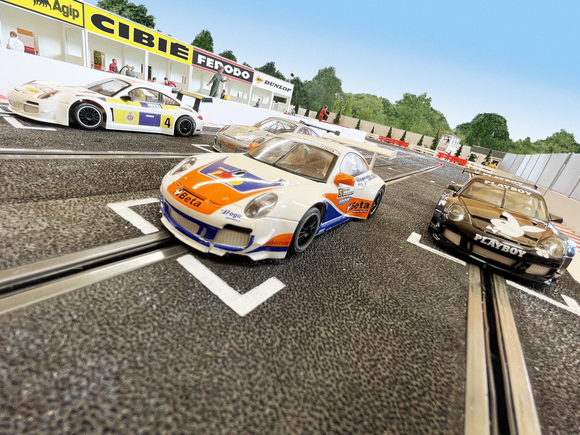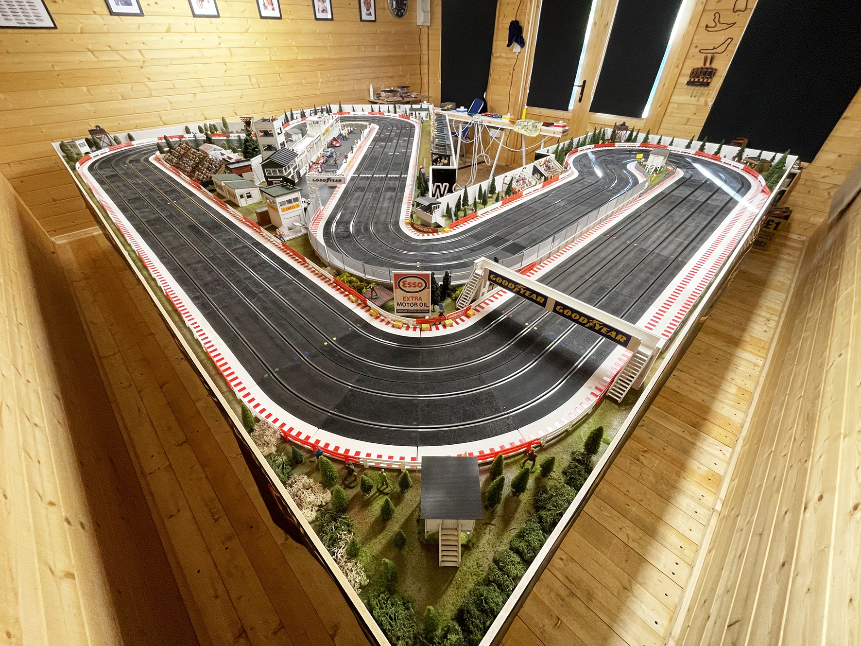 The track is not as big as the loft version, but I enjoy it so much more now. It's about 50 foot, 4-lane Ninco. If George Turner had announced his MDF custom routed track pieces about a year earlier, I would have been tempted to do a three-lane track. But no matter... it keeps me out of mischief :-)