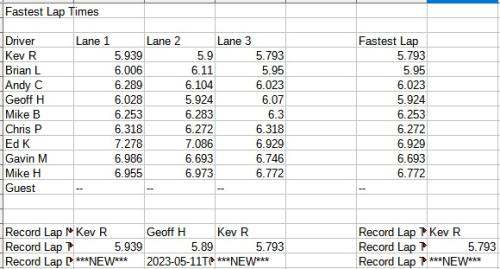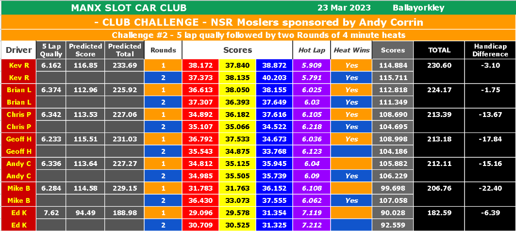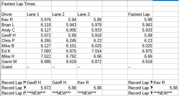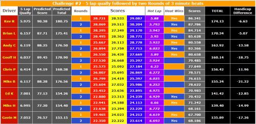 Andy announced we would be running 5 lap qually, the timer was set up with driver listings sorted at random by the computer program. All qually times and predicted scores are shown in the results table.