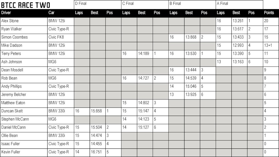 It was a magnificent race for the recently-crowned WHO junior champion, blitzing the other five drivers to take the win by a lap - and he got the fastest lap. In a tight scrap, Matthew pipped Duncan and Andy to the second step-up spot. Stephen rolled in fifth and Jeremy rounded off a below-par BTCC day with sixth.