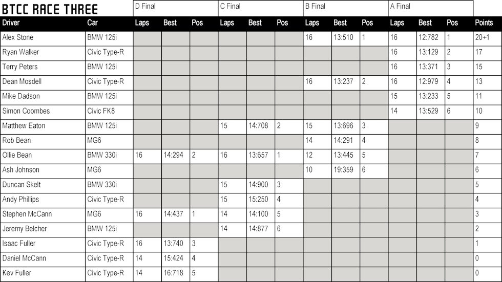 Terry dominated the C Final, but it was Andy who grabbed second, just ahead of Rob and Stephen. Not bad for his first BTCC race in absolute ages. Those two stepped up to the B Final, where Round 3 winner Ryan was languishing after a tricky qualifying and a big power reduction. Although he couldn't match the ballast-free Dean, who won the final, Ryan did beat Jeremy for the second step-up spot, having trailed at half distance. Jeremy finished only just ahead of the impressive Andy, both on 15 laps. Terry and Matthew came home fifth and sixth, a further lap down...