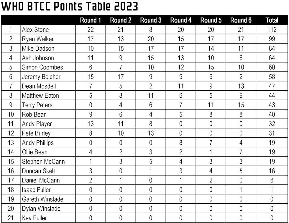 He gets the new WHO BTCC trophy to keep until this time next year. Congrats also go to Ryan, who kept the championship alive with a string of podiums, including an excellent Race Three win last month. Ollie finished top junior after scoring points in all six rounds. Here's the full championship table, including everyone who raced, but only the top 15 in each of the rounds scored points...