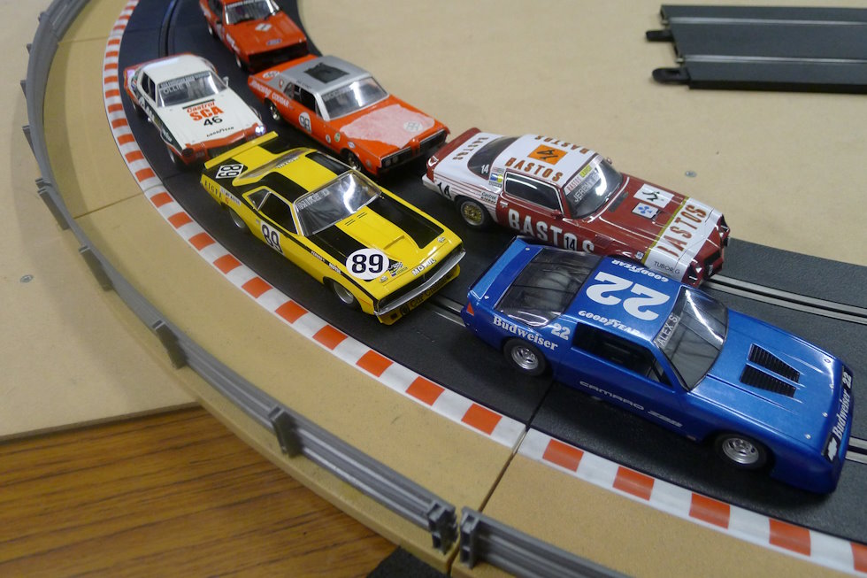 Heat One was a full six-car line-up. Alex's low and lush Camaro IROC-Z unsurprisingly pulled away from the rest of the field, although Stephen's recently Dadsoned Cougar and Dean's Trans-Am Camaro kept as close as they could. Behind the top three, Matthew, Ash and Isaac gradually lost ground. The battle for the second spot was fierce, but in the end it was Stephen who grabbed the place, finishing just a lap behind Alex.