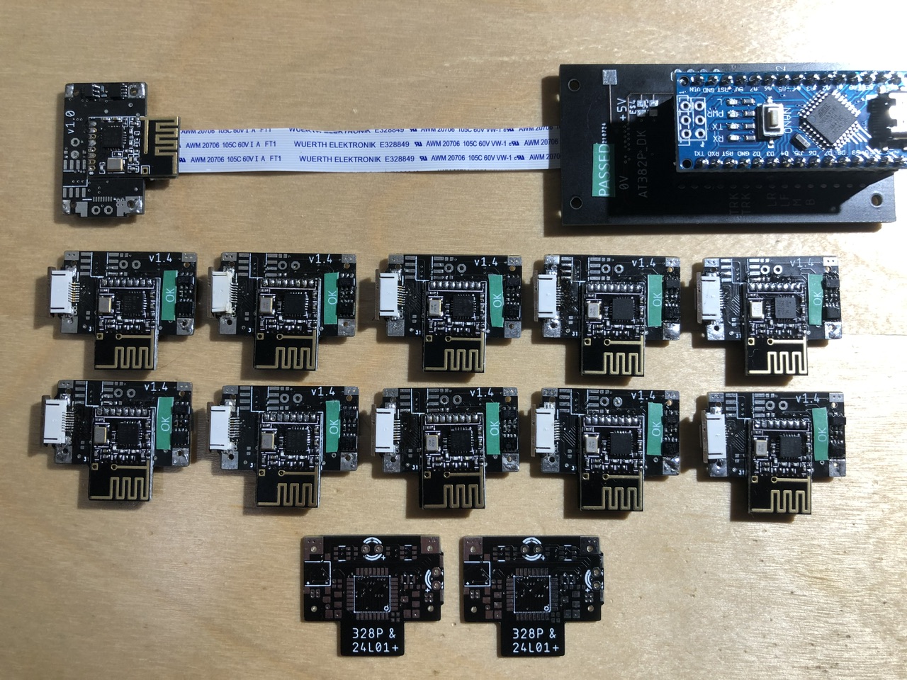 A set of ten prototype in-car decoders which have been hardware tested and then flashed with prototype 12-car wireless firmware.