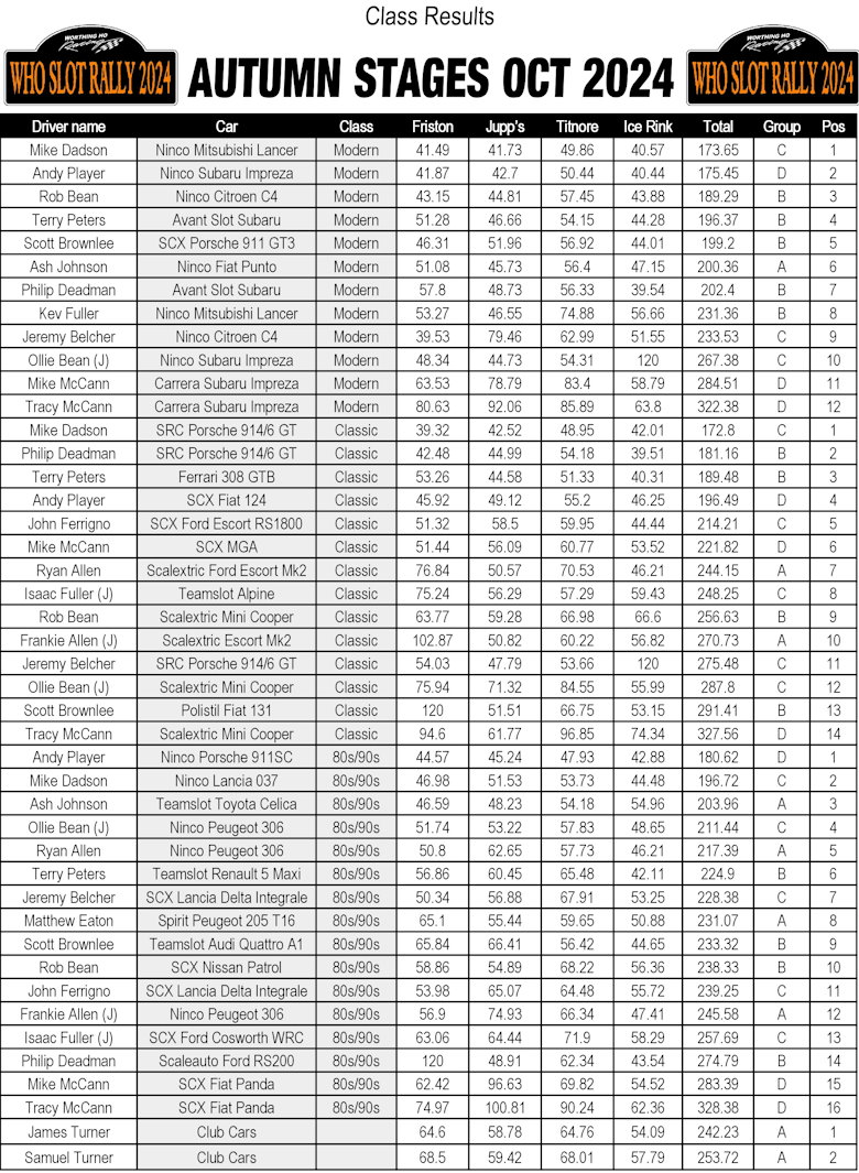 A good mix of overall and class winners on those four stages. A very big thank you to Slot Car Magazine for supporting our first year of slot rallying with some rally-themed back issues for prizes.