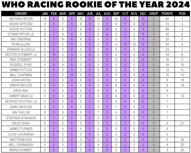 Those 12 races helped Nathan claim the 2024 WHO Rookie of the Year award, taking home an AFX Formula-N car to help him on his 2025 WHO journey. Kevin and Steve complete the rookie podium, with Ethan getting a spot in the WHO Hall of Fame as our 2024 top junior rookie...