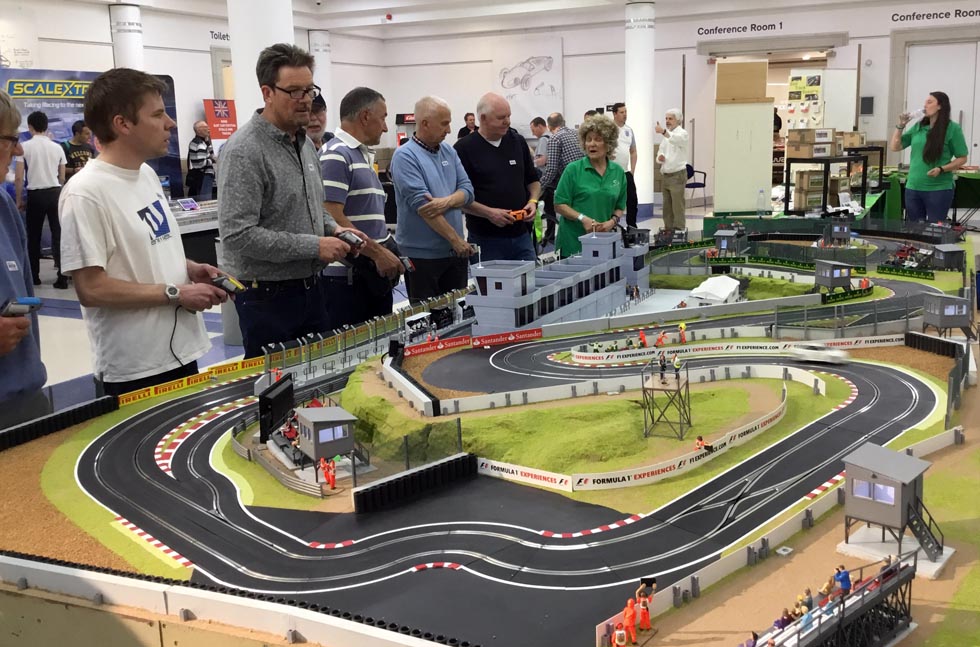 The Slot Track Scenics track is built on ten separate panels, making up an overall area of 5 x 2 metres. There are elevation changes, a pit lane and some tricky corners containing Radius One pieces. However, the super-resistant Scalextric Team Rally cars handle the track beautifully for novices and experts alike. At the Slot Car Festival, the C7042 Advanced Powerbase was used, together with SSDC race management software. For a public display, the fuel simulation is not used - but there is plenty of scope for this to be a great digital club track or the ultimate home digital layout.