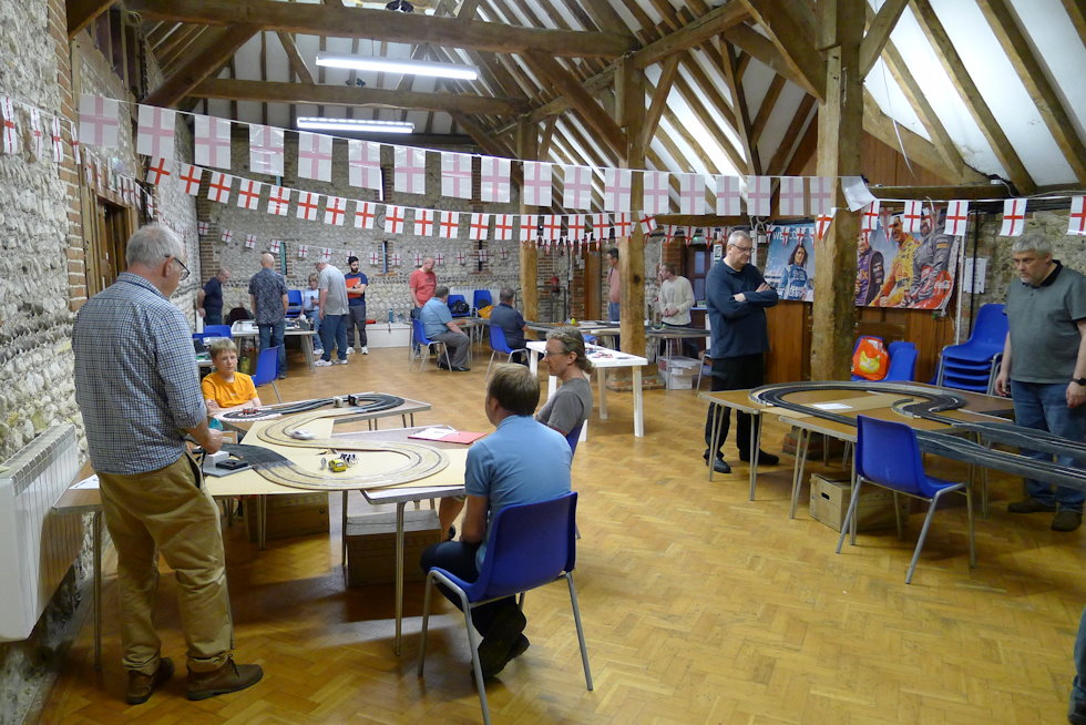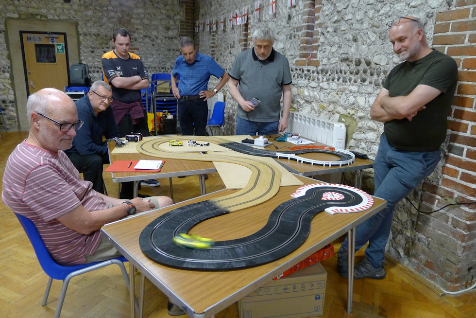 One aim of set-up was to manage table and space to see if we can run six stages for our Slot Rally GB round in July. The plan is to run these four, plus the Ice Rink and a new stand-alone, single lane stage kindly donated by Johnny's Workshop. It looks like there's plenty of room, plus extra for pit tables. Three of the stages went together nicely - including the addition of Phil's HobbyClassic loops. The Boulevard proved problematic, but thanks to Mike's soldering skills it was up and running for the start of the event at 7pm.