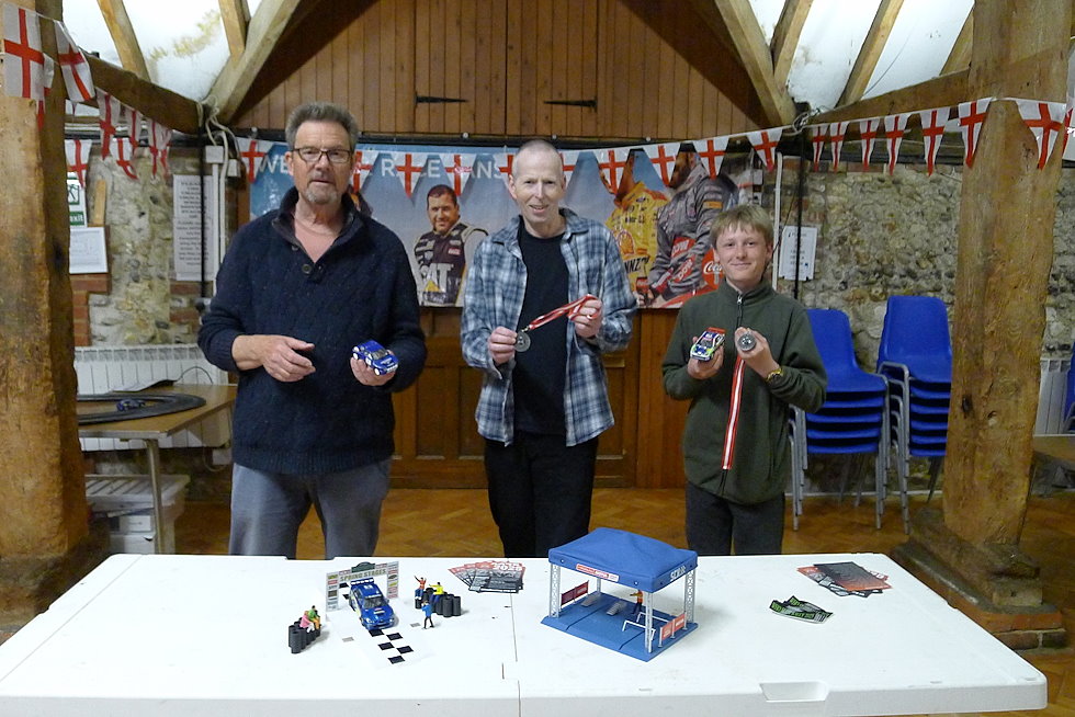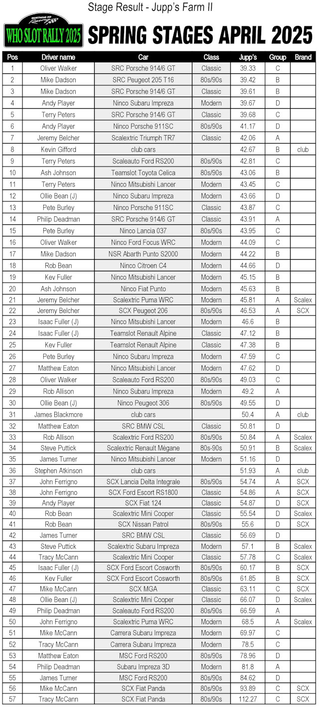 Our second slot rally club night of the year saw 22 drivers compete over four stages with a total of 57 cars. As the south coast was enjoying a bit of a heatwave, snow and ice were in short supply, limited to the deepest, darkest parts of Friston Forest. As usual, Jeremy had tweaked his Classic track layout and we had 3 entirely new stages - including a cut-down version of Jupp's Farm, a new twisty Ninco tarmac stage and a fast Scalextric Sport track...