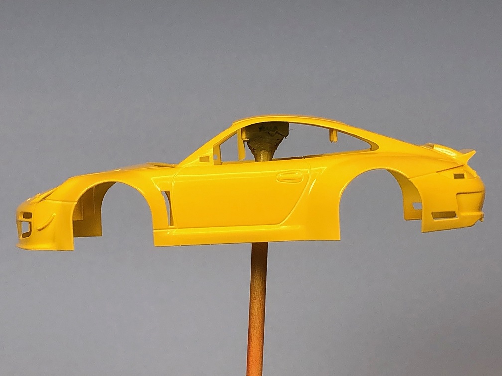 A can of Tamiya yellow is stirring for an NSR Porsche 997 rally car to be painted shortly.