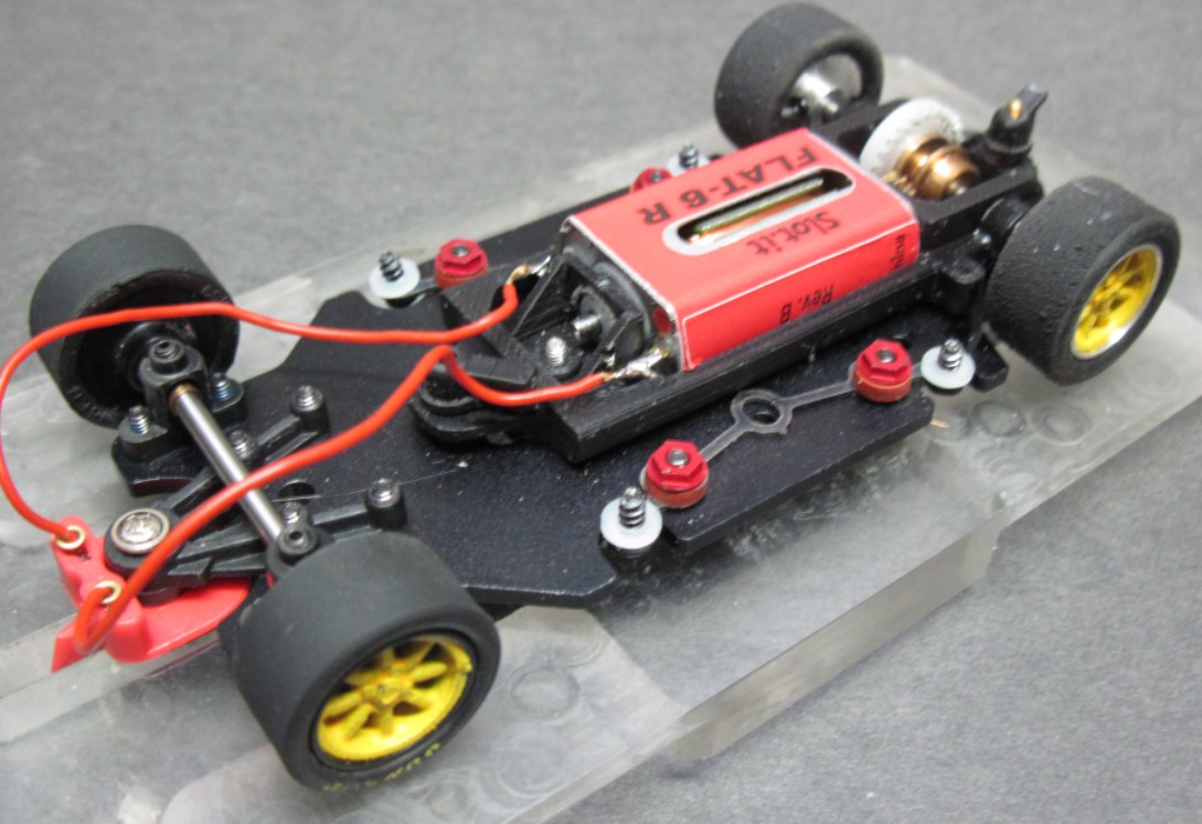 Didn’t bother much with testing the original chassis setup, but went straight to the modifications so I can club race. The car handles well (on home Carrera track) with the low slung heavy chassis plate and the Flat 6 R 22K rpm motor now giving it respectable performance. Handling compared to my other Goodwood cars like the Cheetah is good as it runs smoothly and predictably into the bend with some body movement evident and digs in when accelerating out