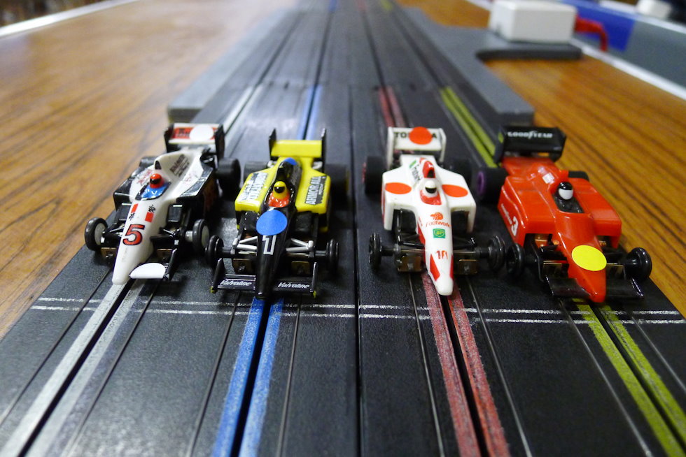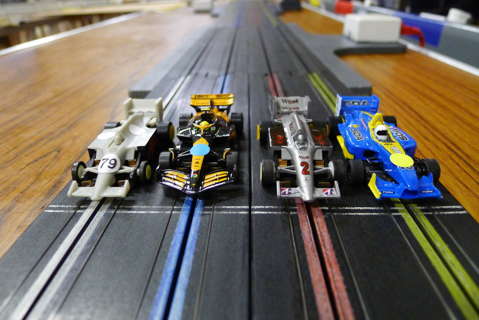 Pete (Super G+) chose red lane for his pole position while Keith (Mega G+) had gone for blue. This felt like it would be a classic confrontation. Keith’s MG+ cars always seem made for these twisty tracks while Pete can wring the neck of an SG+ in an almost unmatched manner. Oliver (Super G+) has been a consistent feature of the A Finals this year and he’d be going from yellow with Ryan feeling pumped and confident that white lane could give him a double victory.