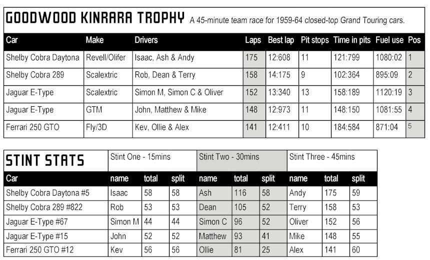 The Cobra Daytona sadly went off the boil in the second half of the race and the DB5 had some problems that momentarily dropped them to the back. However, Alex got to grips with the Corvette and managed to close in on and pass rookie Simon, who was having a good run with the slower of the two Fly Ferraris. Having got into the podium places, Alex found chasing down the leading two pairs a much tougher proposition. As time ran out, Mike & John took the win by 4 laps, with Dean & Ash two laps ahead of the Corvette. The second Ferrari finished less than a lap ahead of the DB5, which had recovered very well from its mid-race troubles...