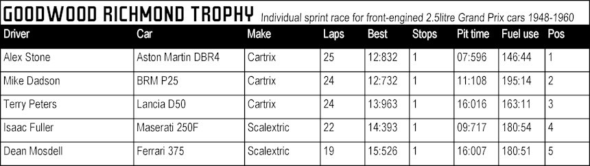 Alex's Aston was proving more economical on fuel than Mike's BRM and he took the lead as Mike pitted. A shorter stop then gave Alex a crucial advantage on the road, which he extended to a lap by the end of the race. Terry was third, Isaac fourth and Dean fifth...