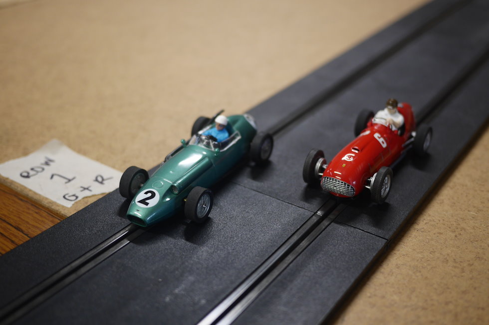 A few loaners came out for this one to ensure everyone had a drive in the final race of the day. We had four pairs in the line-up: the Fullers shared their Ford GT MkII and the Beans their beautiful Fly Porsche Carrera 6 - plus Ash & Oliver drove Andy's Gulf GT40 and Simon M & Matthew were in one of Mike's GT MkIIs. Most pairs split the 10 minute race in half, but Simon M raced the heat and Matthew the final. The first three cars in each of the two heats would go through to the Feature, the other having a short 5-minute consolation race.