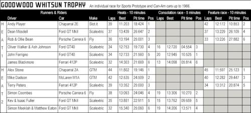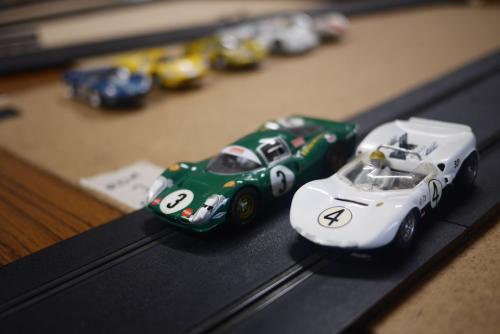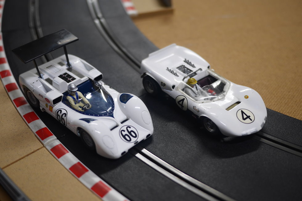 Heat Two proved to be faster, as Alex and Mike pushed each other hard at the front in their beautifully turned-out George Turner kits. Alex's Chaparral 2A would finish five laps better off than the Heat One winner. Mike came in second, two laps back, with Terry third. Simon just missed out, his Fly Porsche just not able to stay with Terry's Ferrari. Isaac & Kev were fifth and Simon M sixth.