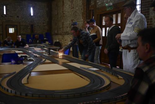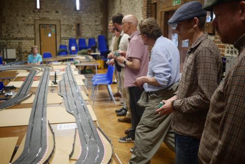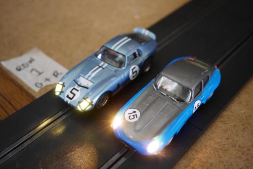 Our 15 racers fitted perfectly into five cars, giving each of them a 15-minute stint. Three 'Pro' cars featured in this race - Mike's George Turner E-Type Jag, Alex's Fly Ferrari GTO with a 3D printed chassis and Andy's Revell Cobra Daytona with an Olifer chassis. Simon had prepared his standard Scalextric E-Type specifically for this race, whereas Dean's purple Scalextric Cobra was making a second appearance of the day. As with the previous three races, we'd see if the 'Pro' cars could last the distance. The Cobra Daytona won last year and in 2023 thanks to mechanical issues for its rivals, Mike's E-Type won the first race in 2022 in similar fashion...