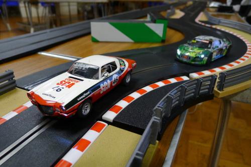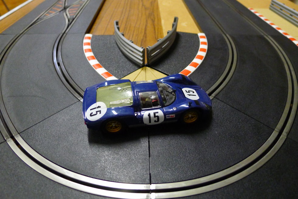 We never quite got to the bottom of the short circuits, but with the race set up as it is, it wasn't a huge issue to restart twice. It prolonged the agony for Oliver, whose borrowed Whitsun+ cars was off the pace. The Days of Blunder Camaro needed time in the garage, but the Fuller-Beans banged in their best run of the race so far with Rob's new Slot.it Porsche 962.