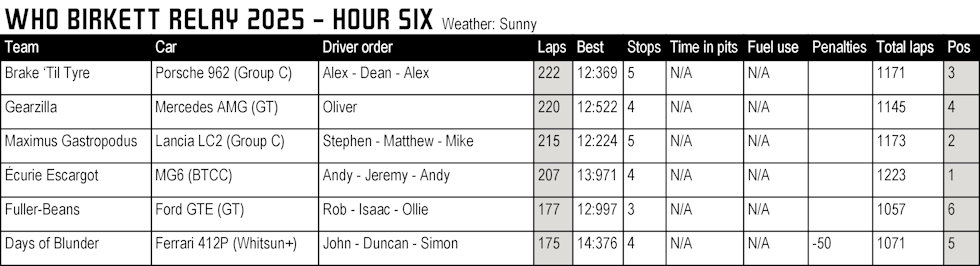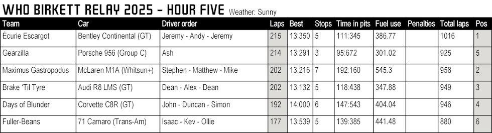 The track was now dry - and would remain so for the whole hour. Three GT3 cars (Brake TT, Days of Blunder & Écurie Escargot) were joined by Gearzilla's Group C, the Fuller-Beans Trans-Am and the George Turner McLaren M1A of Maximus Gastropodus. This hour would see the most laps completed by all six teams so far. It was Ash in the Gearzilla Group C that had the best of the first 19 minute stint, but then Andy hauled the Escargot Bentley into the lead during the middle session. Despite a humdinger of a battle, Jeremy held on to that one-lap advantage to win the hour and clock up 215 laps - the best score of the day for Écurie Escargot.