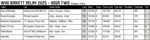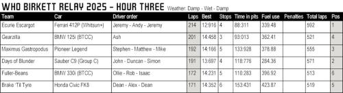 At the front, Écurie Escargot, Days of Blunder and Maximus Gastropodus battled in out in overcast conditions on a damp track. Intermediates were the tyres to have, although not everyone made it easy for themselves! In the end, it was the Days of Blunder BTCC Honda that took Hour Two honours and the lead of the race overall...