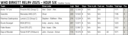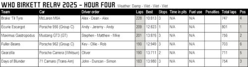 At the end of Hour Four, the McLaren had completed a massive 228 laps, giving everyone else a thrashing and lifting Brake 'Til Tyre back up to fourth overall. The Écurie Escargot Porsche 956 was second with 209 laps to maintain the overall lead. Third were Maximus Gastropodus and their rapid Mustang GT3, hitting 201 laps and moving up to the runner-up spot overall. Days of Blunder led the Fuller-Beans by one lap in the Handicap race...