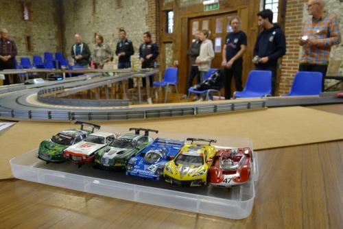 The hall lights were turned off for the final hour. Thankfully, all the teams had remembered to keep a car with working lights - although it was still very tricky to see anything in the gloom. The weather dice threw another fully-dry hour to make things less complicated. This looked to be another rapid hour - two Group C cars (Brake TT & the Gastropods), two GT3s (Fuller-Beans & Gearzilla), Days of Blunder's Ferrari Whitsun+ car and Écurie Escargot's BTCC MG6.