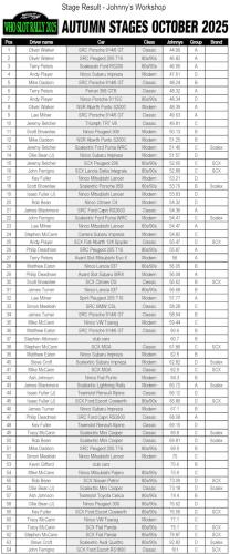 Twenty-four drivers and 64 cars took part in our WHO Autumn Stages last night. It was another very enjoyable evening and after the four stages were complete, the gap between winner and runner-up was a tantalising 0.02 seconds!