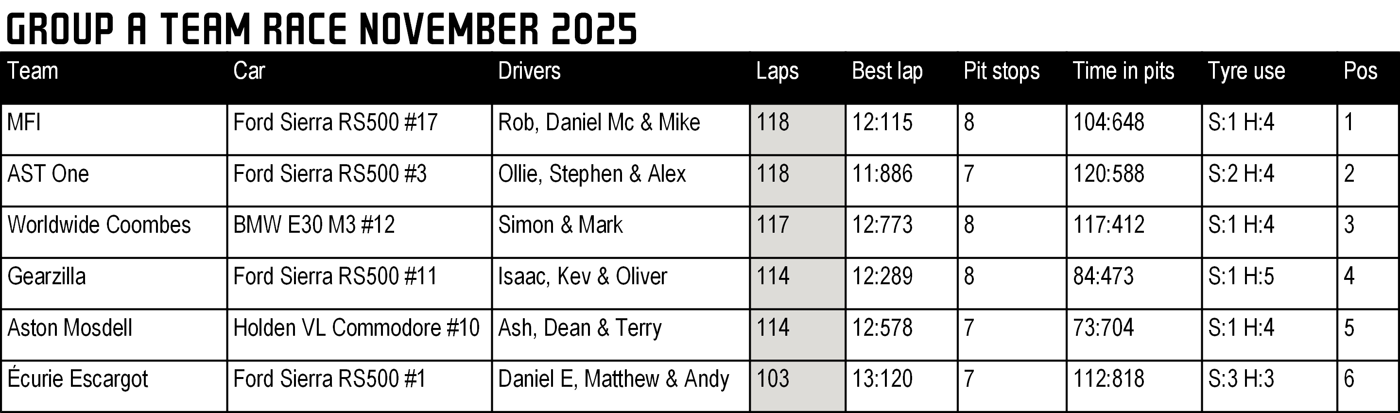It was incredibly close at the front with three cars in with a shout of the win. The BMW was out of sequence on pit stops and Mark dropped off the lead in the pits - but the others - Mike and Alex's Sierras - would need to stop too. The Commodore had dropped off the lead pace and Terry had Oliver closing in fast. It did eventually come down pit stops. The red Sierra of Mike, Rob & Daniel spent 16 seconds less in the pits and finished on the same laps and just ahead of Alex, Ollie & Stephen's blue car. Mark & Simon came in a lap behind, Mark just couldn't match the pace of Mike and Alex in the closing stages...
