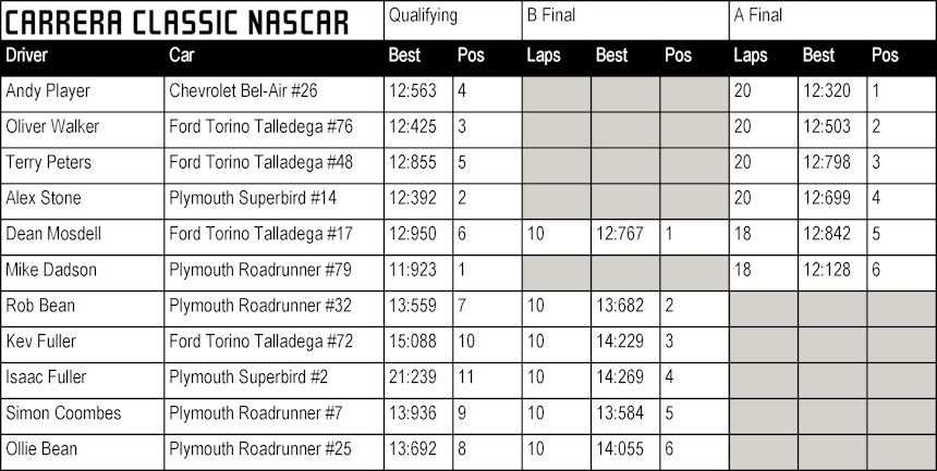 The five-minute shoot-out was the final action of the day. Alex surprised everyone by entering the pits early on and topping off his tank. That meant he could go to the end and it placed his Camaro in some free air. And there was quite a squabble for position in what was a frantic opening. At halfway, Oliver led Mike in a Chevy Monte Carlo 1-2. Terry was third with his Hemicuda and Alex was back up to fourth, ahead of Andy and Ollie. When everyone else had to pit for fuel, Alex swept into the lead. He ended up completing 24 laps in five minutes - a huge score. Mike won the battle for second, finishing a lap behind Alex and a lap ahead of Oliver and Terry. Andy and Ollie were a further lap behind after scrappy races.