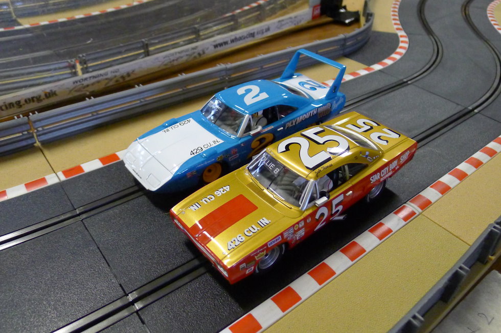 Mike & Alex lined-up on the front row for the feature race, with Oliver & Andy on row two and Terry & Dean at the back. As usual, it was a very tight pack early on, until Mike de-slotted and collected Alex & Oliver and Andy's '57 Chevy slipped through into the lead. It was a slender advantage, Alex close behind with the winged Superbird. After 5 laps it was Andy, Alex, Oliver, Dean, Terry and Mike - all on the same lap. Alex had a bit of a wobble and that took some of the pressure off Andy, who was keeping things very smooth with the narrower fifties Chevy. At half distance the top three remained the same, but Mike had moved up to fourth, ahead of Terry and Dean.