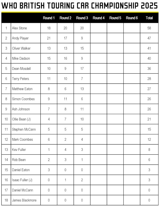 That put Alex and Andy equal on 38 points for the championship, Mike with 31 and Oliver 26.