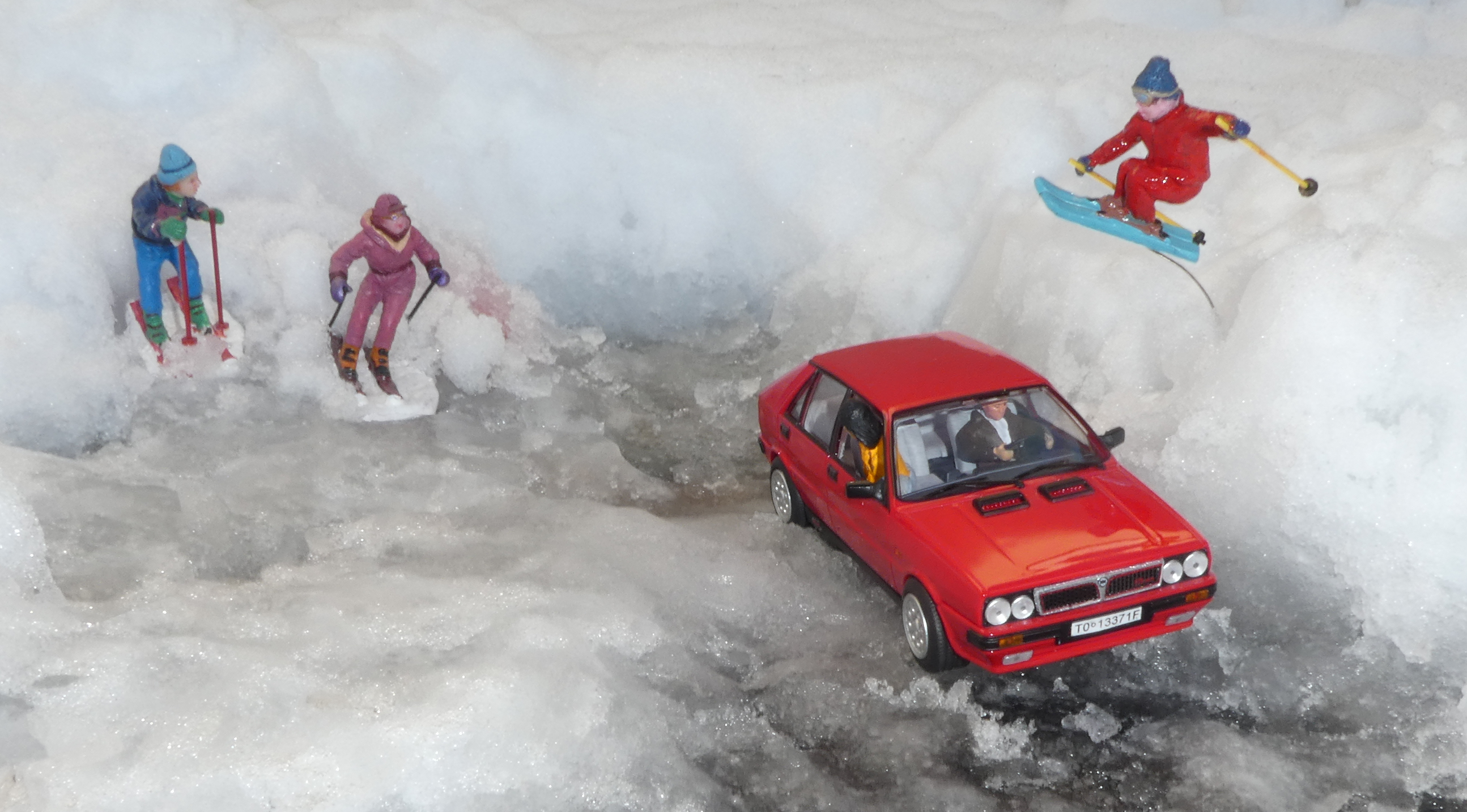 When Team-Slot produced their Delta HF 4WD model I used Lemax skiers to mimic a Lancia advert: