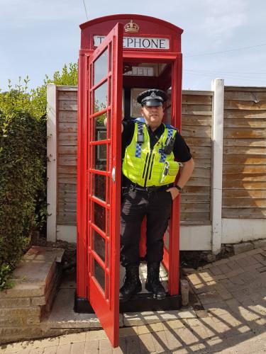 Either that bloke is 7 foot tall or the telephone box is a different (smaller) scale