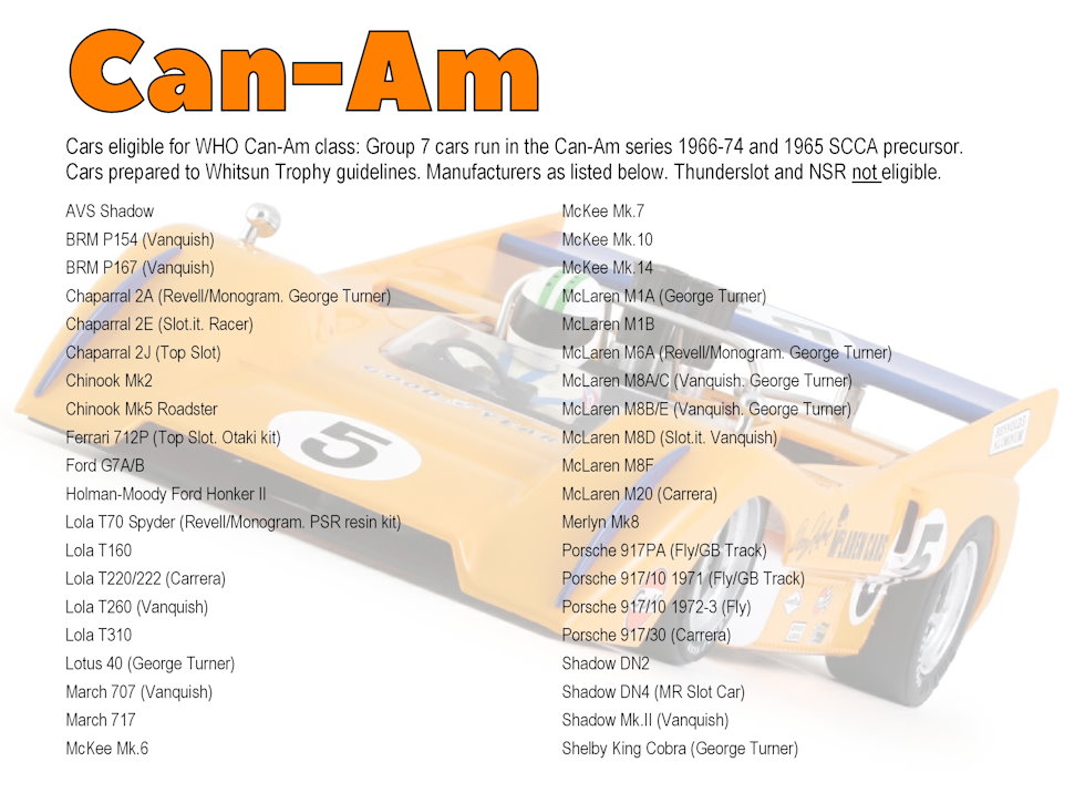 Race Four is Can-Am - another individual race featuring models of the unrestricted monsters that delighted crowds from 1966 to 1974. We will use brand eligibility and regs from the Goodwood Whitsun Cup and limit entry to genuine Group 7 Can-Am cars (plus the 1965 SCCA precursor): no GT40s, Ferrari 330s or Alfa 33/3s please. This list may be useful...