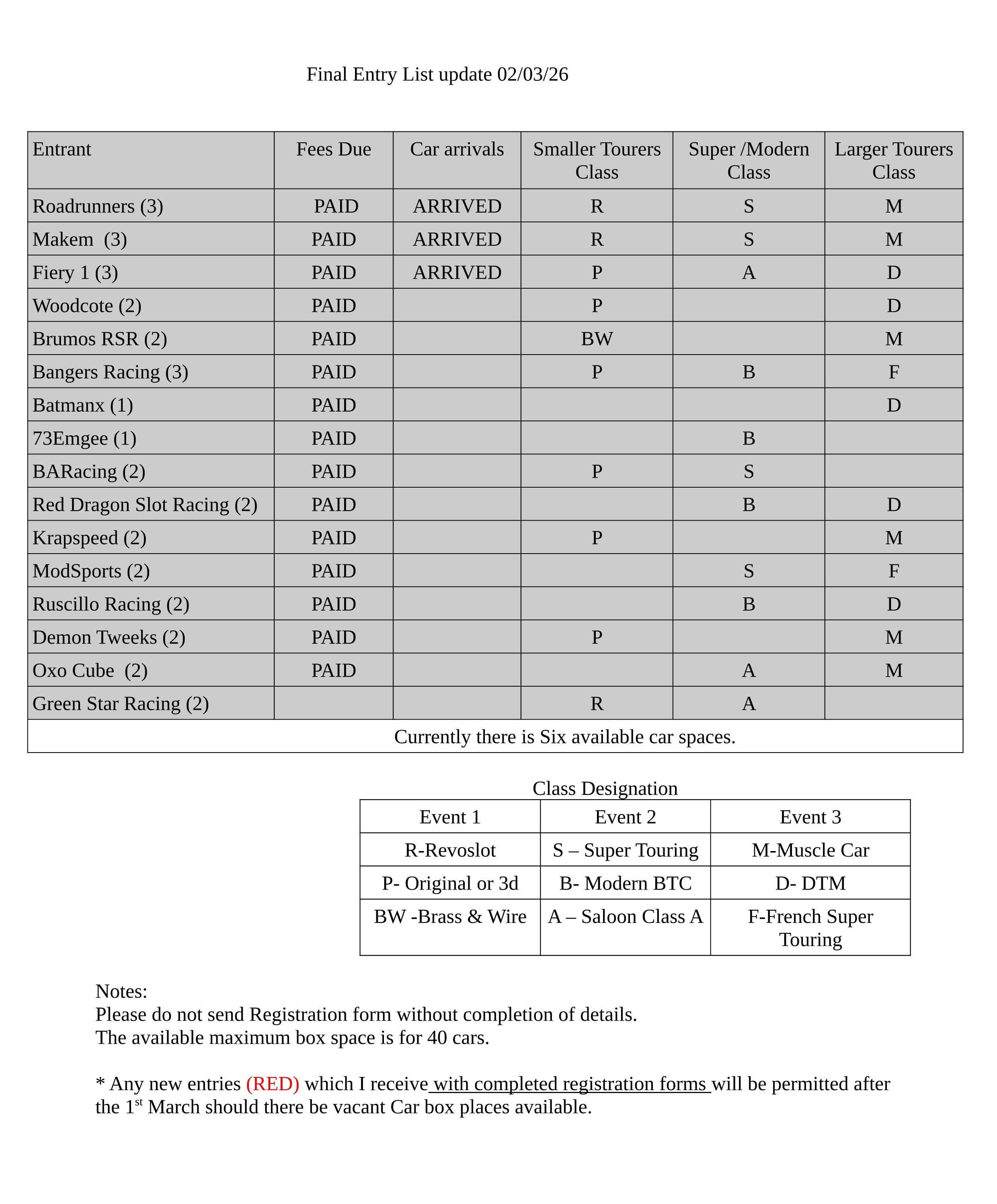 I have added on the leading page  a "Entrant List update table" which I will fill in as I receive the registration forms.