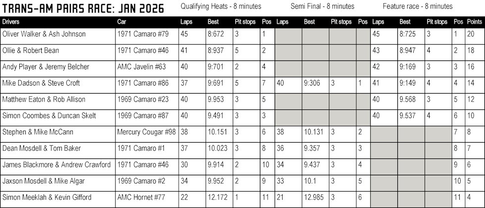 Heat Two was more chaotic - six cars, less experienced drivers and one very hard-to-handle AMC Hornet. Andy & Jeremy did their best to keep their AMC Javelin out of trouble and finished first with 40 laps, enough for Feature race qualification. Behind them, Stephen & Mike grabbed runner-up spot for the McCann Cougar- a nice drive, but their 38 laps only put them in pole for the Semi. Mike D & Steve would be right behind them in Mike's '71 Camaro, having picked up 37 laps and a faster best lap than Dean & Tom. Jaxson & Mike A were next - 34 laps was a great result for two first-time racers and tribute to Dean's team management skills. Andrew & James completed 30 laps for fifth place and they would race again with Simon's '71 Camaro. Finally, the Hornet rounded out the qualifying order, Simon M & Kevin managing 22 laps.